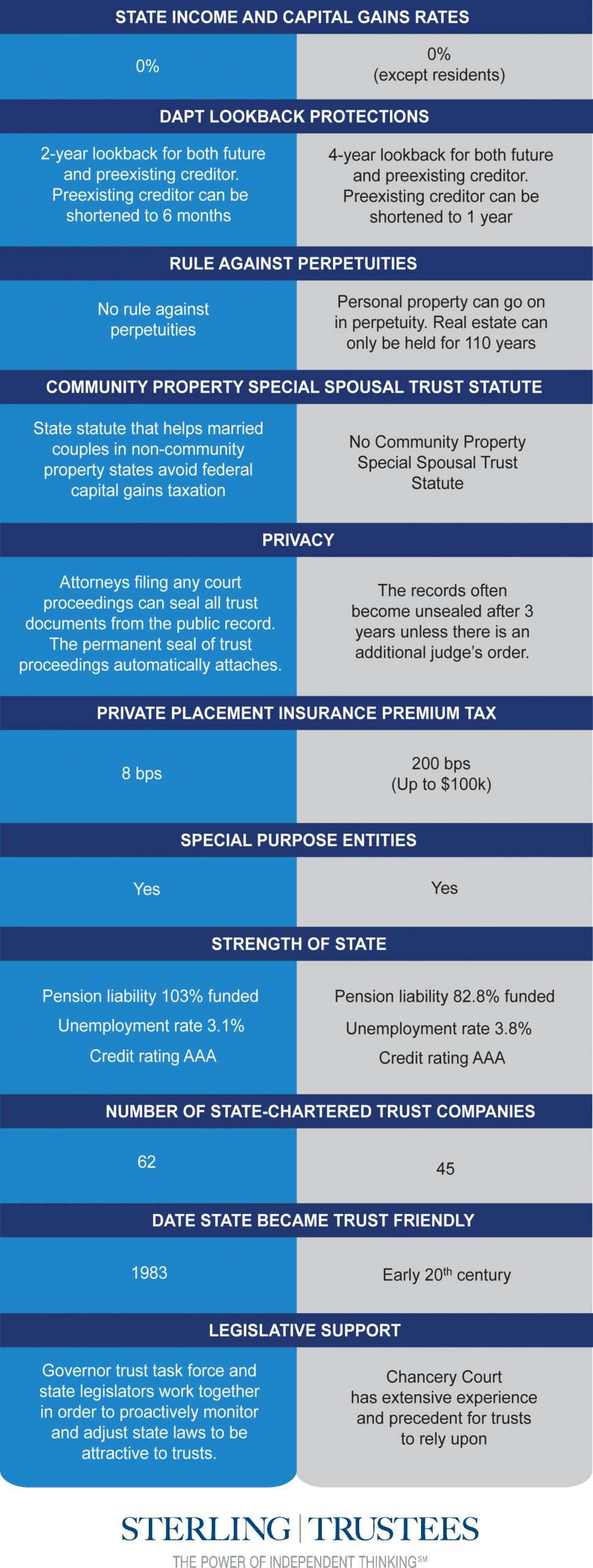 South Dakota’s situs advantages over Delaware position it as a leading trust jurisdiction for long-term wealth planning. While Delaware is well-regarded, a South Dakota trust company offers greater benefits, including no state income tax, stronger privacy protections through non-public trust court records, and more flexible trust laws. South Dakota’s unique trust task force ensures its legislation stays ahead of industry trends, giving clients and advisors a more dynamic and forward-thinking environment than Delaware can provide.
